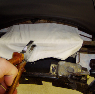 Tip 4. The central panel of the seat back is called the flute pad. On a modern seat this would have fixings to hold it to the foam. Triumph did not do this so the flute pad can sit a little away from the foam. I try to make sure the calico and bottom panel are both tight to improve the tension in the flut pad. Some customers have glued some or all of the flute pad to the foam. If I were to do this I would first fit the cover without glue to make sure everything lines up. Then I would release the fixings on the bottom panel to allow access to the flute pad and foam. I would then apply solvent based contact adhesive onto foam and flute pad then re-fit the bottom panel. Finally, push the flute pad onto the foam using heavy books etc and leave overnight.